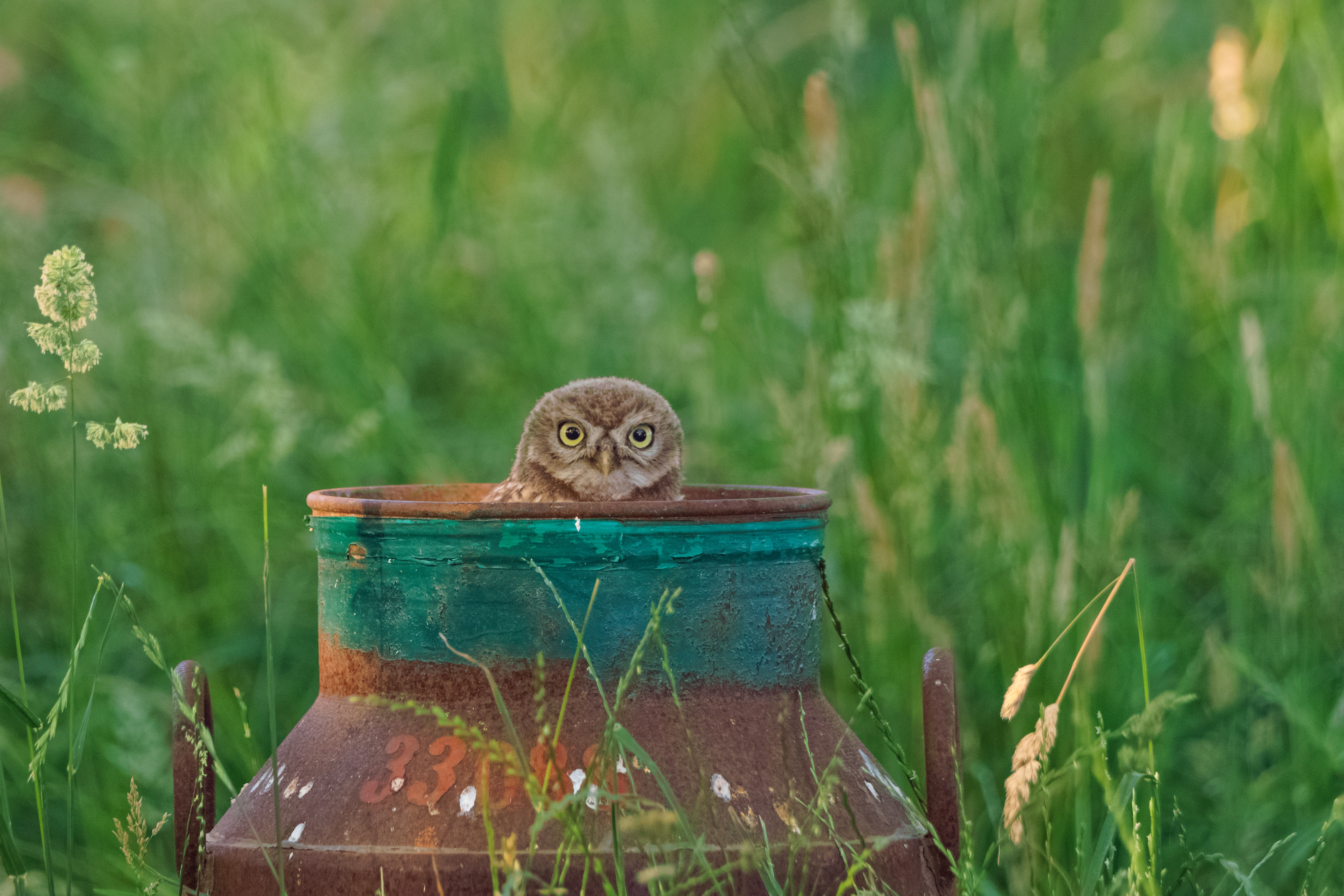 Deze jonge steenuil kwam in de melkbus een kijkje nemen